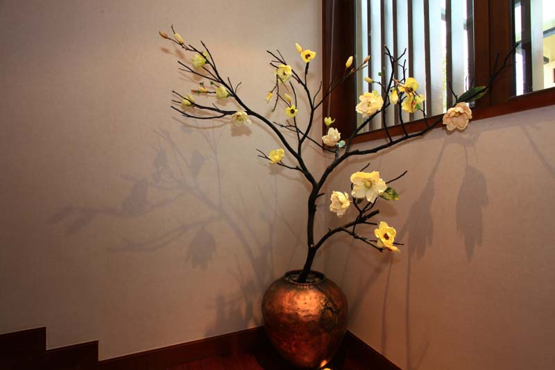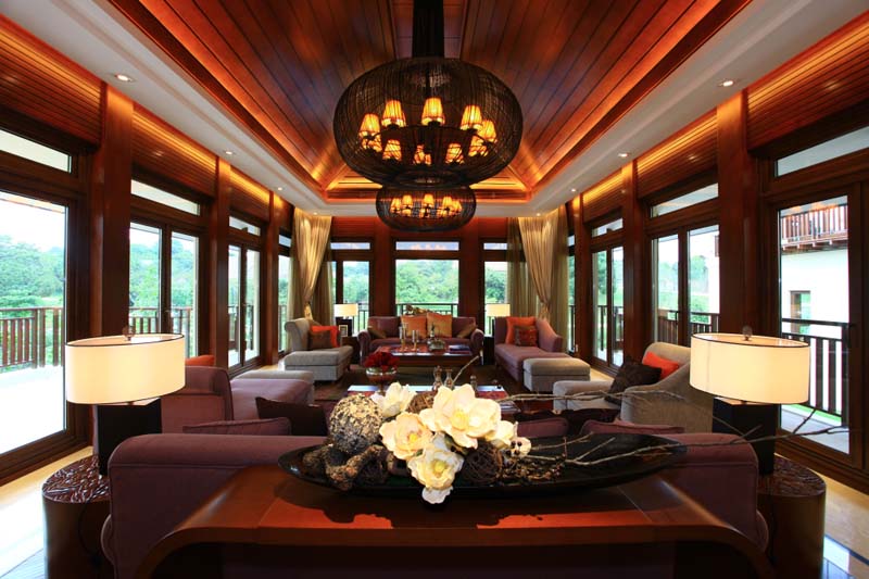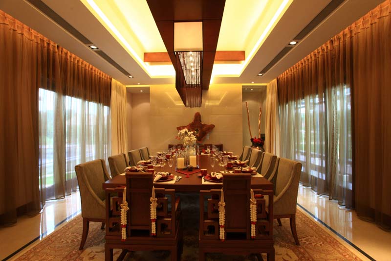 在大餐厅中,采用精致的地砖铺砌,作为房间顶部的天花板是装饰重点。房间中天花板就是“天”,这里作出凹欹的灯池,有聚水之意。这里的吊灯根式显得钗垂簏簌格外典雅。配合窗纱,沉浸在这朦胧旖旎而又极富高雅格调的空间中,静飨佳肴。