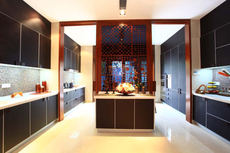 餐厅中整齐切划和两面墙的橱柜让空间随时保持干净整洁,配合中岛柜和花格元素,让人沉浸在内蕴古雅的中式格调中,尽情享受整洁便利的现代厨房中的便捷。