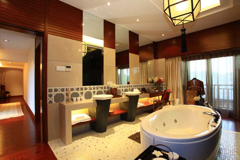 浴室中采用马赛克地砖带来活泼跳跃的元素,开阔的开间,和自然采光,让浴室摆脱潮湿沉闷的传统浴室的压抑,使人在洋溢着温馨和自然中尊享健康卫浴生活。整体别墅设计说明采光的重要,之余为什么台湾风格钟爱通透玻璃窗也就不言而喻了。