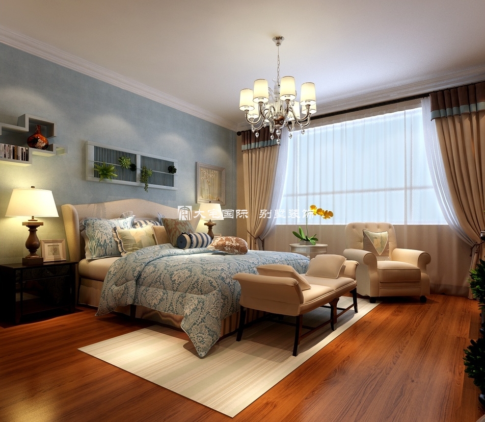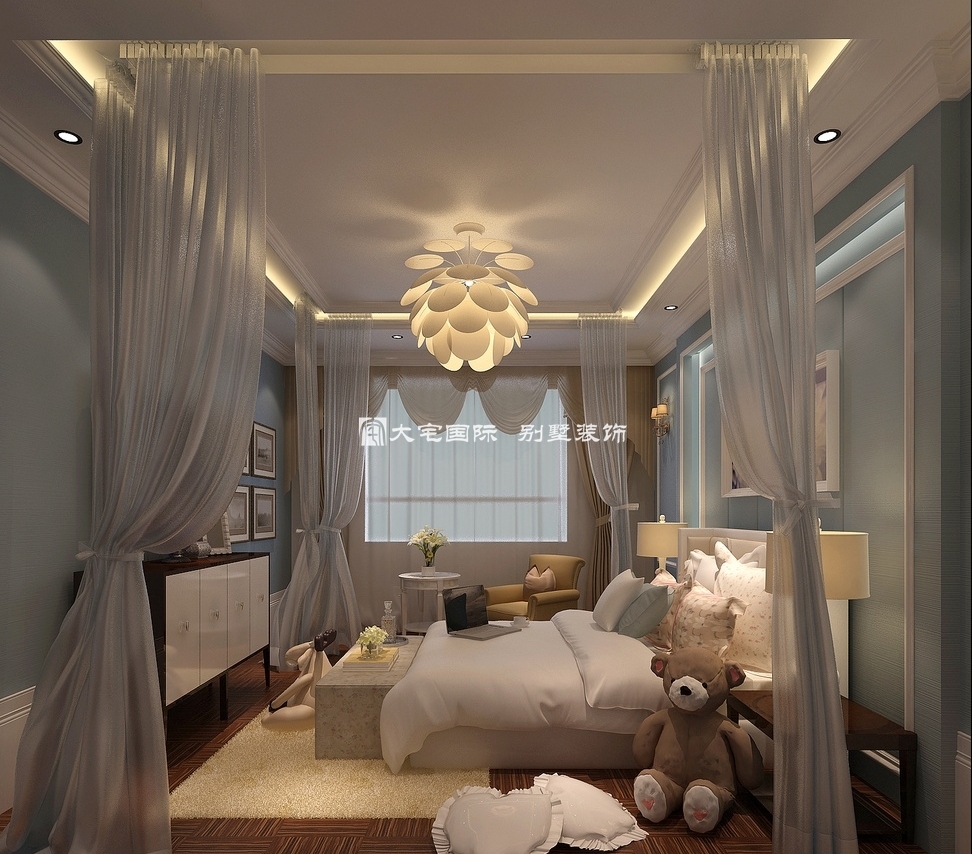 专业的别墅装修设计公司,在进行美式别墅装修设计中,不会毕其功于一役,上图我们看到的一样,卧室不同于其他房间的色彩设计,这样就可以给别墅主人以新的空间环境。