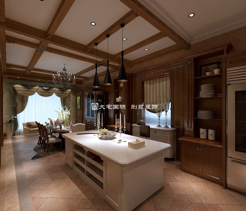 美式风格别墅装修,别墅设计师将整体环境以咖啡色渲染,使简单的用餐环境,立时变得情意绵绵,好像一日三餐也变成了对美好生活的品味。