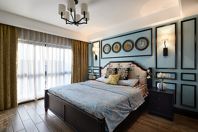 美式装修别墅设计卧室空间明显才偏田园路线的设计,给人在摩登的整案装饰中营造一丝田园的舒适与温馨,设计在这里注重人性化体验,缓慢的节奏诠释经典。