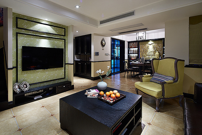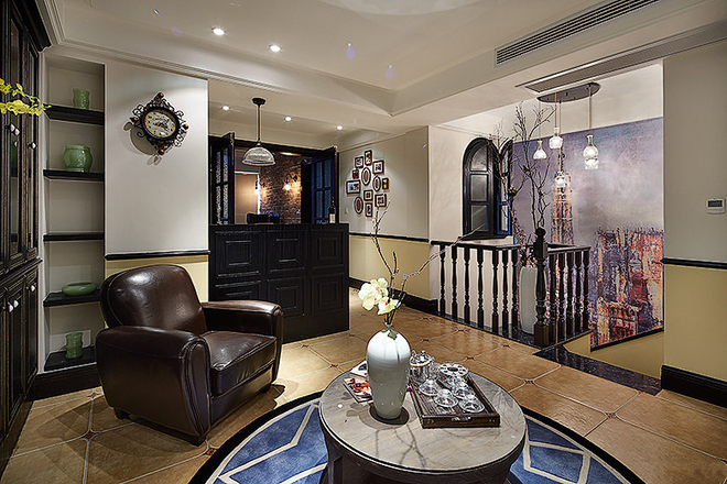 大厅充满艺术质感的地面铺装撑托其一堂的典雅,似乎在它的装扮下,整个空间都上升了一个高度。印花墙纸以及黑色边框也融入了东方元素,就像美国的一个缩影,杂糅着各地的文化艺术。