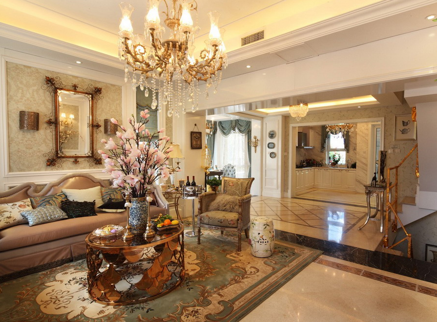 此案例 美式别墅设计图 中,向我们近景展示了别墅正厅水晶灯饰的华美。璀璨如星光般的灯光效果,让人们在此房间中,感...