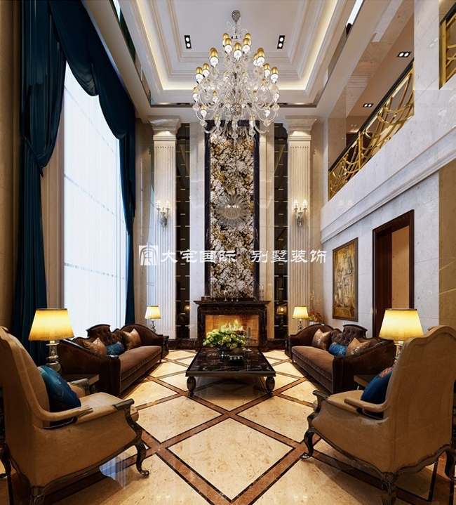 欧式别墅客厅是最需要表现出经典设计手法的场所,别墅设计师使用水景吊灯、古典沙发,巨幅壁画等,配合空间的距离感将经典之意完美塑造。