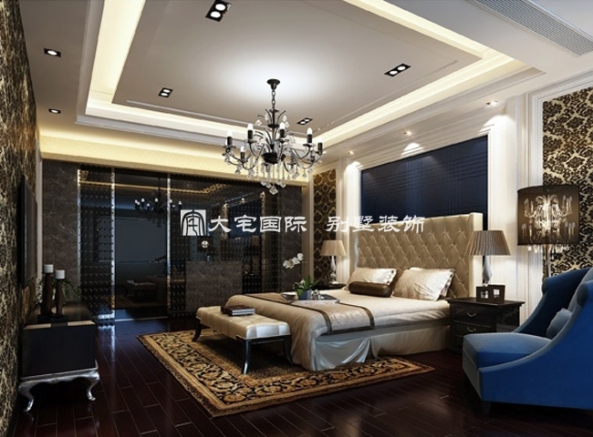 欧式别墅卧室以独特的、充满抽象理念的吊顶来表达出不同凡响的效果。正所谓经典可以在传统的思维模式上继续创新。