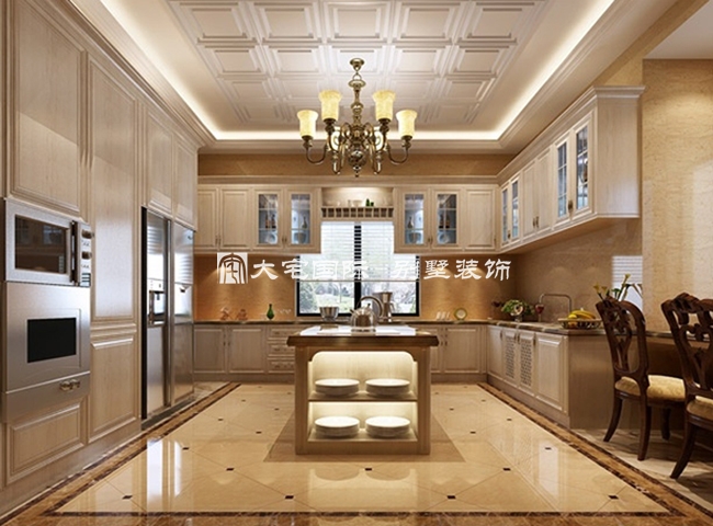 为给别墅主人营造出全方位的经典之感,别墅装修设计公司在厨房设计中用偌大的空间来衬托中心用餐区域, 从而使雅致之感油然而生。