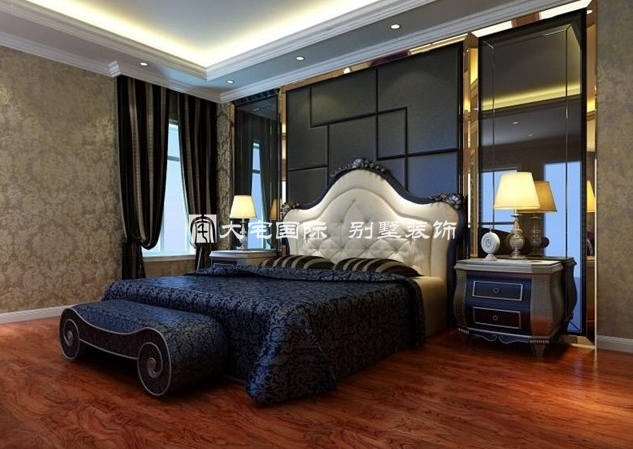 作为欧式风格别墅设计案例,别墅设计师特别在主卧中遵循了大宅国际的别墅设计理念,通过华美灯饰的时尚感、精纺布艺的古旧风,营造出与户主高雅的气质、品味相得益彰的浓郁艺术氛围。