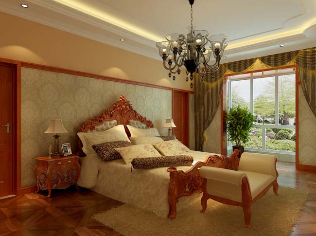 设计师结合整个别墅装修方案的设计主旨,选用木质元素彰显质感、配合水晶灯饰彰显欧式设计特色。
