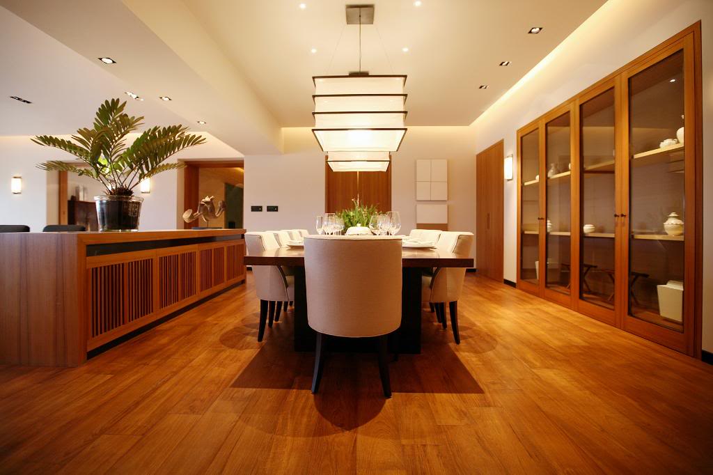 餐厅中通过一组地柜与客厅区隔开,吊灯庄重而华贵,如星光般点缀在天花板的灯饰,为餐厅带来更均布的彩光。温馨柔和的色调,典雅的笔触,彰显温文尔雅的氛围。