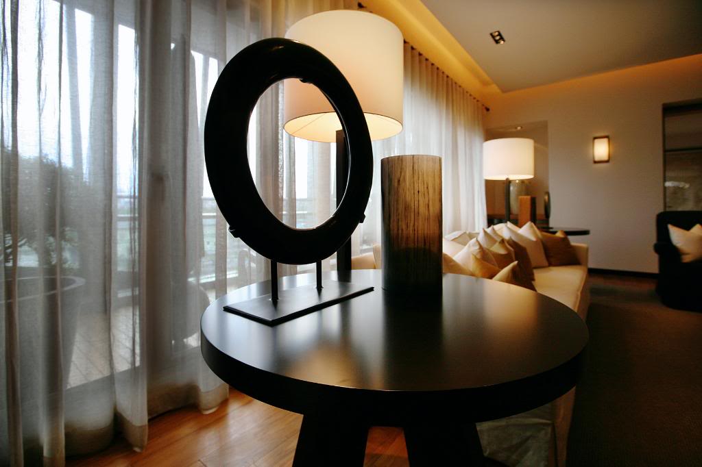 器形简约的宫灯,和圆环形摆件,给人现代建筑中那充满了简约时尚的线条,和用洗练笔触构筑出来的清新典雅的古朴与恬静。