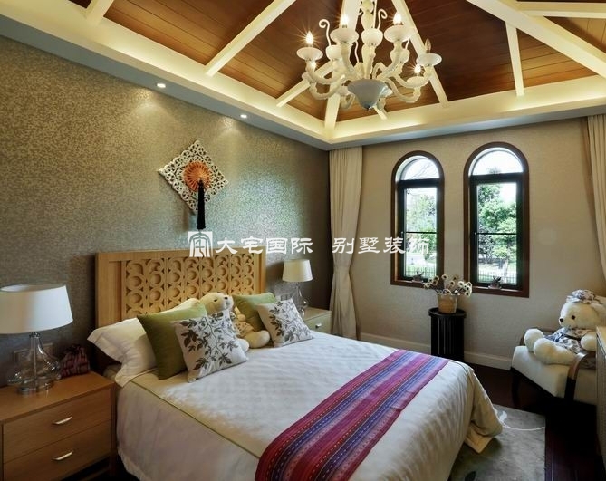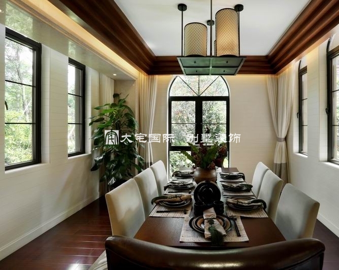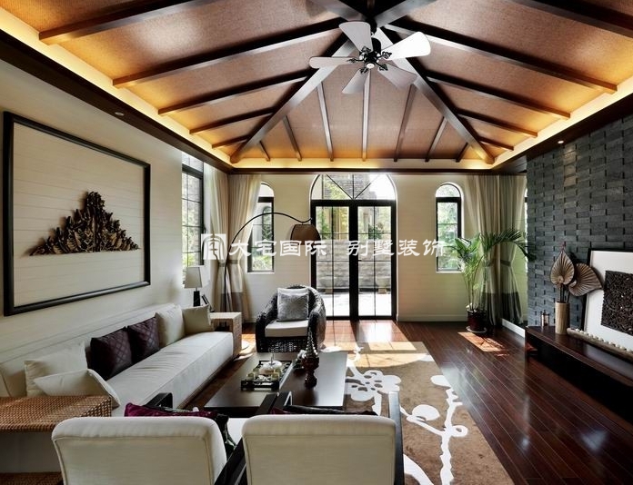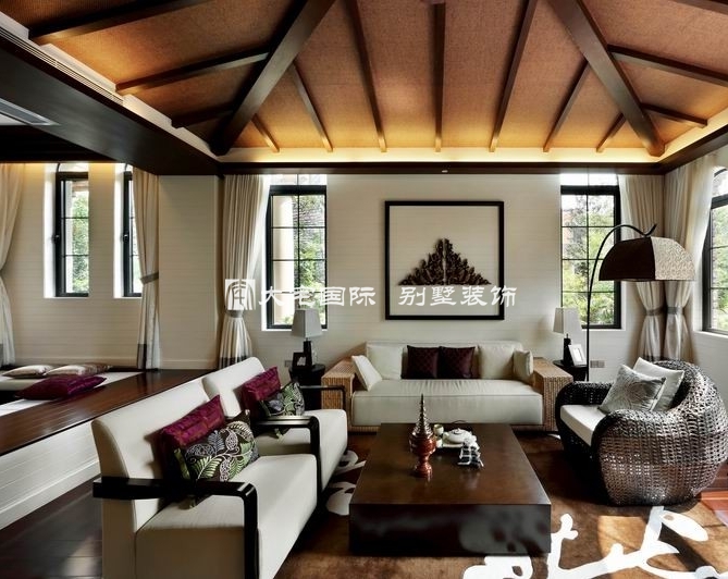 别墅设计客厅以大气优雅为主,木制半透明的圆拱门与墙面木装饰的装饰造型,以冷静线条分割空间,代替一切繁杂与装饰。在配饰上,东南亚风格别墅设计的饰品和色彩艳丽的抱枕衬托出客厅活跃的气氛。