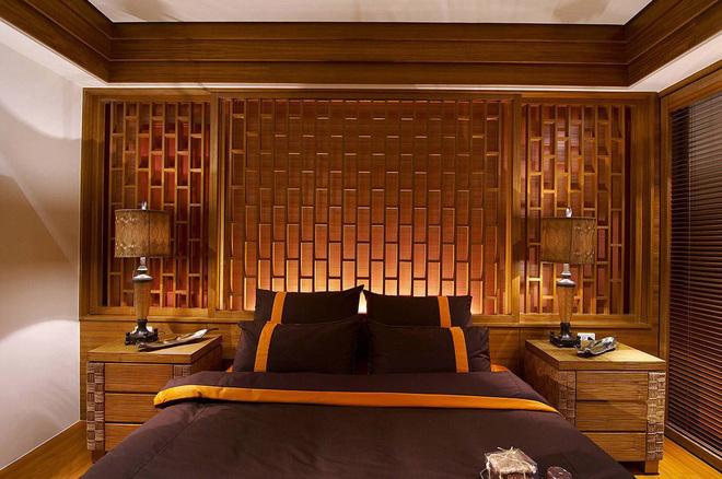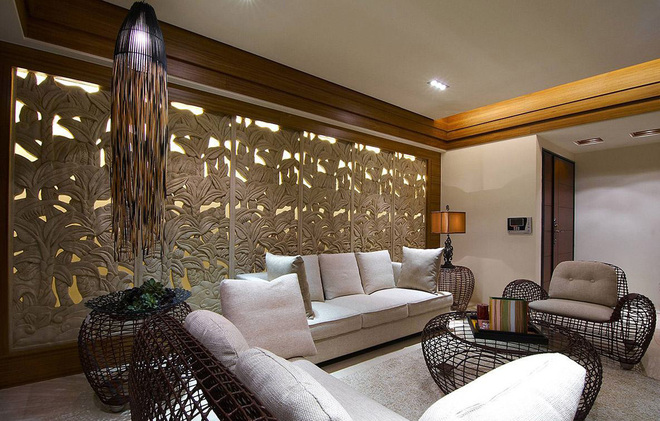 别墅装修设计通过背景墙的主题以满足主题的原则确定并选取古典元素进行围合,从东南亚最具代表的植物中选择适合主题展现的别墅植物材料进行装点,彰显了作为东南亚别墅装修所富有的独特魅力。