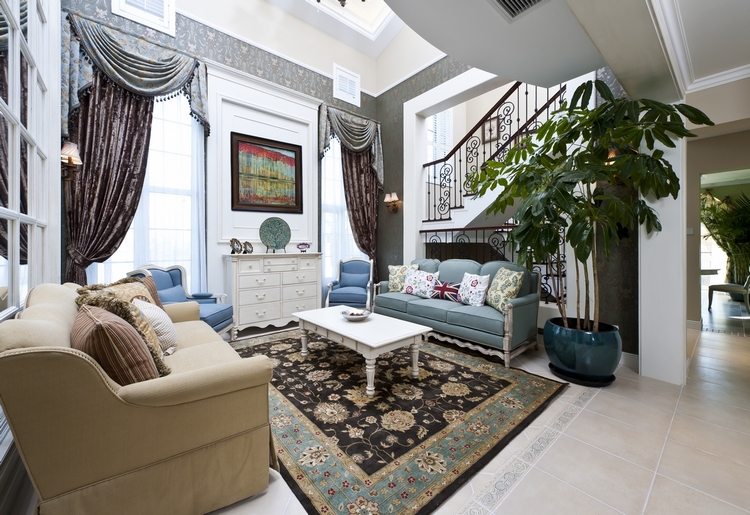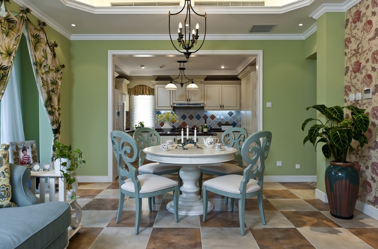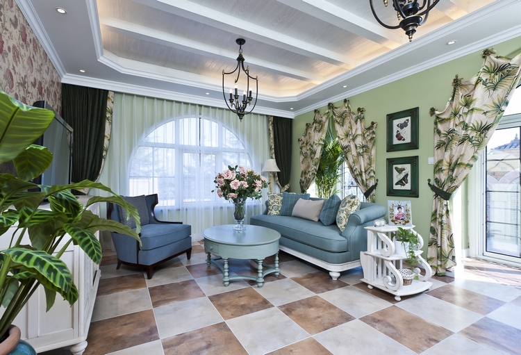 地中海风格别墅装修中,可以以绿色作为设计的主题,如果蓝色代表一片无垠的大海,那么绿色就有可能是海边那一片茂密的针叶林了,这张别墅设计案例,虽然展示出一种奢华的浪漫,同时也不乏自然之美。