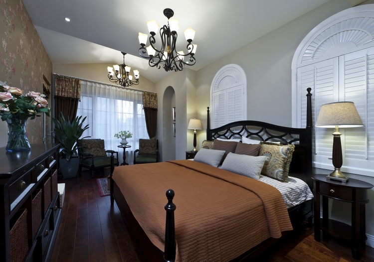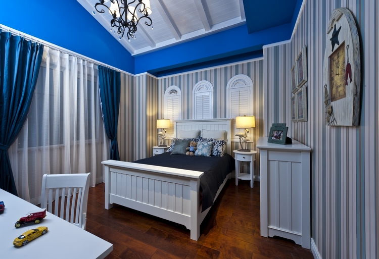 从此地中海别墅设计景观中,我们可以看到设计师特别注重空间中光影效果的配比和层次变化。进而其中的吊顶灯饰和床头台灯,也就自然成为了地中海别墅设计案例中,卧室部分的主要设计素材。